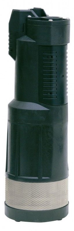 The Patriot F900 submersible drain pump is equipped with a plastic housing, a vertically directed nozzle, an intake window and a float switch.