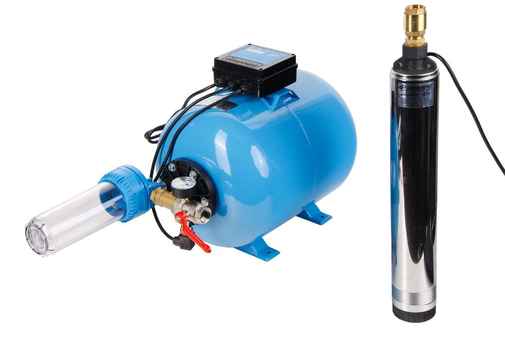 The system has a pressure gauge, a check valve and a shut-off and control element with a special indicator. The device operates at a depth of 30 m and delivers a pressure of 50 m. The power consumption of the engine is 1.1 kW, due to which the throughput is 3 cubic meters per hour.