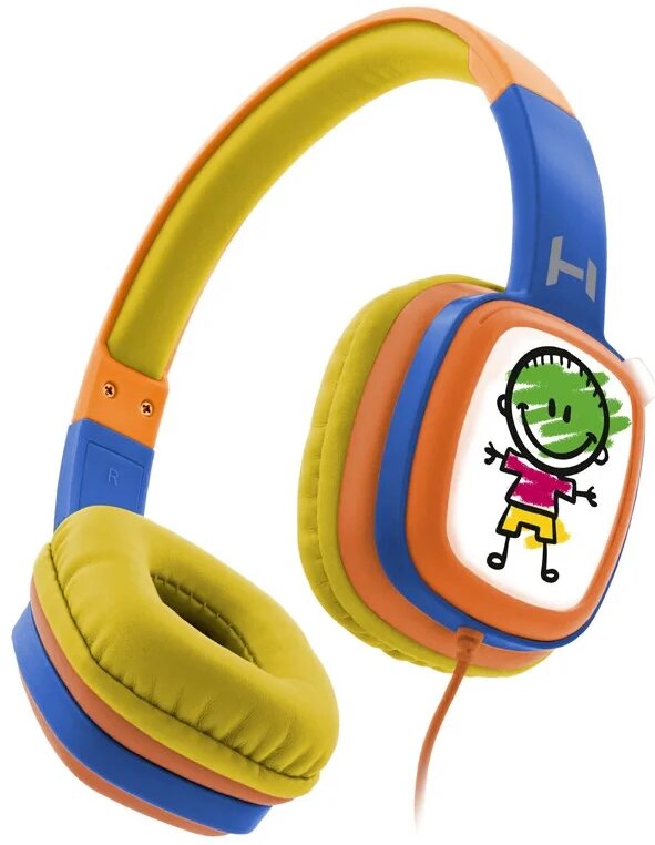 Bright, consisting of orange, blue, yellow details. Case material - plastic, ear pads - foam rubber. The top arm is adjustable. The outer side has pockets for interchangeable inserts that you can paint on your own (a figure of a man).