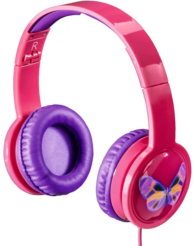 Suitable for girls from 3 to 8-9 years old. The main color is dark pink. The inside of the ear pads, speakers, inner part is purple. A beautiful butterfly on the outside of the monitors.