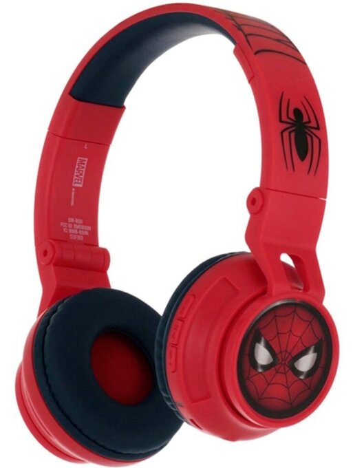 Attracts with the image of a spider-man on monitors, black spiders - a bow. The main color is red. The inner surface of the headband and monitors is black.