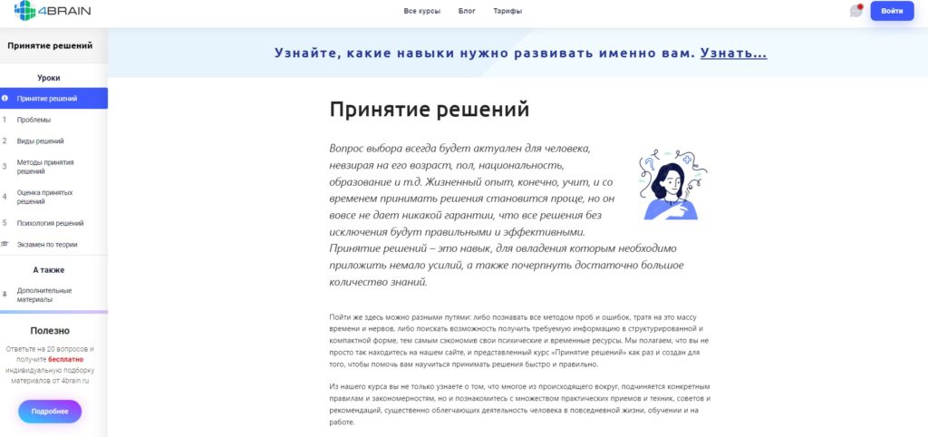 The famous platform 4brain offers a course aimed at learning the skill of decision making. The material includes an introductory lesson, 5 training blocks and a paid exam on the information studied. In addition, the brain development platform offers a list of additional self-study materials that will increase knowledge on this topic.