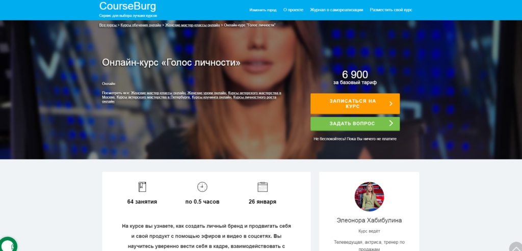 Designed for people who often have to speak to a wide audience, bloggers, as well as businessmen who promote their products through social networks. Even the passage of such a course helps to reduce fear when being in the frame. He teaches the correct behavior in front of the public and how to interact with the well-known TV presenter and part-time sales coach Eleonora Khabibulina.