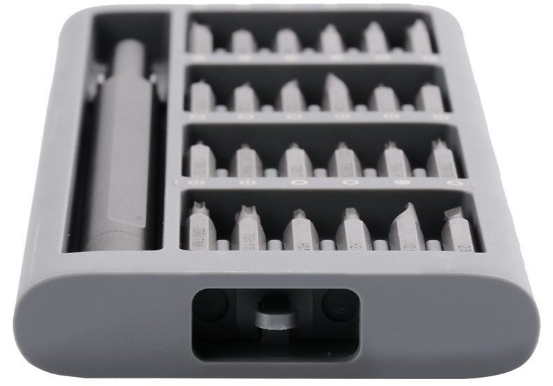 This screwdriver is distinguished by the presence of a huge set of nozzles, consisting of 24 units. This set is ideal for precision work in any conditions, both for beginners and professionals.All components of the screwdriver are honed at the highest level, the bits sit in the groove without backlash. The tool, along with all the attachments, is perfectly located in an ergonomic case, the material for which was anodized aluminum, and the top layer is covered with an anti-corrosion layer. As for the tool itself, it is made according to European standards and has comfortable edges that make it comfortable to hold in your hands. Ease and simplicity in operation is provided by a long, strong core of inventory. The back of the screwdriver is equipped with a cap, under which the nozzles are located. It can be easily twisted with a finger. All bits have a magnetized structure and are rigidly fixed in the grooves.