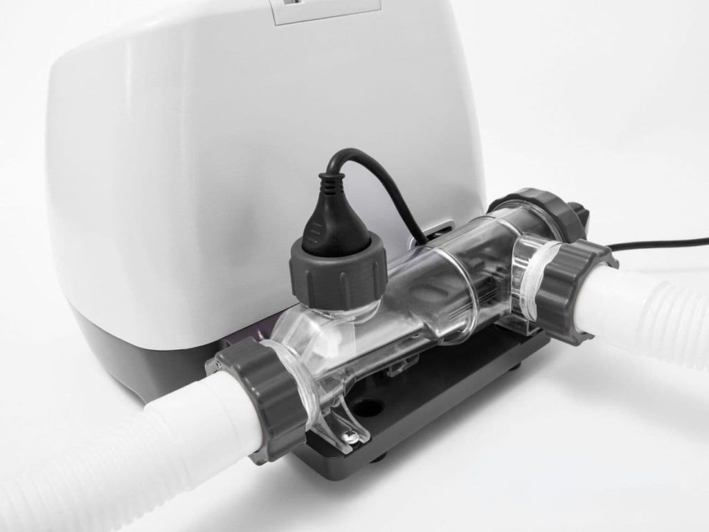 This ozonator has its own peculiarity. Manufacturers have added to it the function of producing chlorine from table salt. This chemical element disinfects water well. Such chlorine does not pose a danger to humans. It does not irritate the mucous membranes of the cornea of the eyeball. It turns out a double treatment of water. It gives a higher degree of purification of the liquid. The unit generates 11 g of chlorine and 150 mg of ozone in 1 hour. The device should be installed in pools with a volume of no more than 56.8 cubic meters. The whole system is equipped with a self-cleaning function. It works in three modes, which differ in time. On the body there are buttons for controlling the unit and a small display. There is also a scheduling function using a timer.