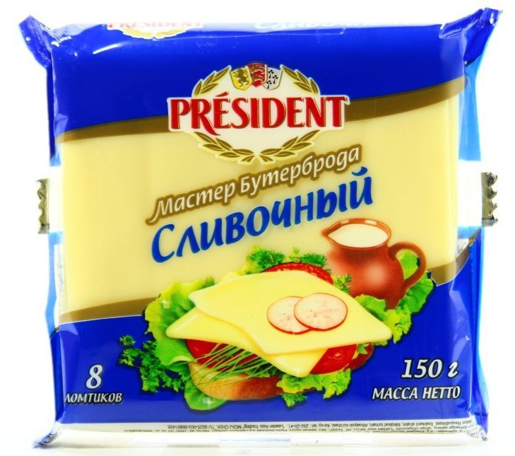A wonderful product from the famous brand "President", which has a delicate creamy taste, won the love of customers who speak positively about the quality of the product. Many share their own recipes for a quick snack using President slices. For example, you can toast bread and put a slice, a thin circle of tomato and a piece of ham or sausage on it. It can also be used as a filling for buns, as hot cheese is very tasty and becomes viscous. As part of the product, in addition to natural ingredients, there are food additives that are not harmful.