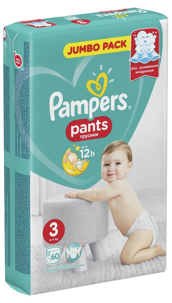 Pampers, a brand that has long won the hearts of many parents. Pants are made of soft material with a cotton-like texture that gently touches the skin, does not rub it and guarantees comfort and relaxation for 12 hours. The micropores contained in it guarantee air circulation, removing all vapors, and the microgranules absorb up to 30 times the weight of the child.The incoming liquid is evenly distributed through the channels, without forming irregularities and lumps. The absorbent layer in products intended for boys is reinforced towards the tummy. Pampers Pants are easy to put on and take off quickly, do not hinder movements and provide excellent protection against leakage, do not have foreign odors.