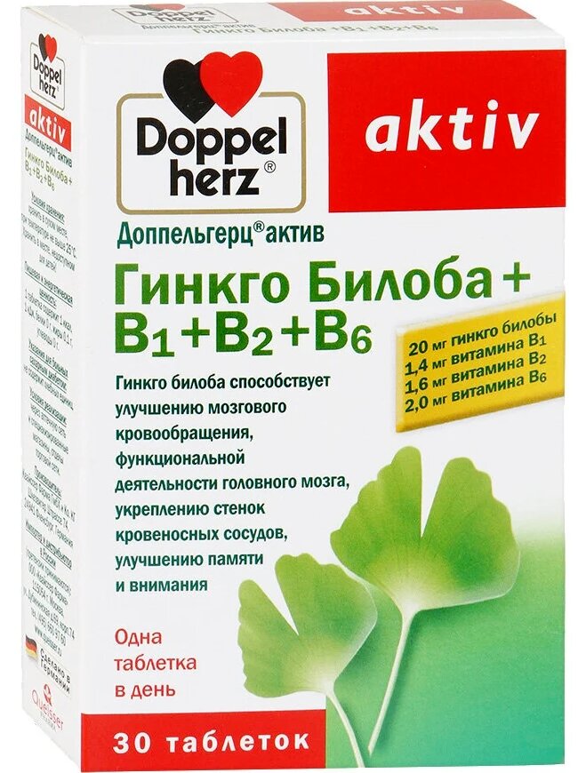 30 tablets are available in a rectangular cardboard box. Design - white background, red and yellow areas, green font, drawing of Ginkgo Biloba leaves.
