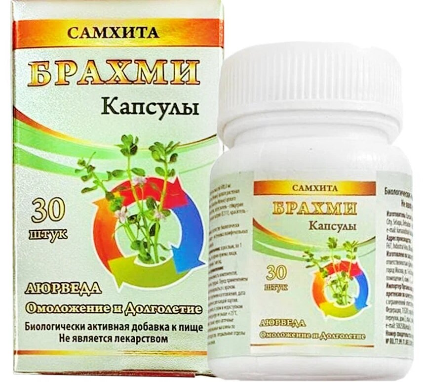 The Indian drug Brahmi Set contains 30 capsules in a white plastic jar packed in a cardboard box. Refers to dietary supplements, means of Ayurveda.