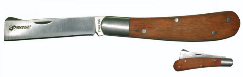 Grafting knife with tongue is made of stainless steel. The tool is designed to work with small branches of trees and shrubs. A special tongue is used to bend the bark. The blade folds into a handle. The knife is of good quality, the blade is marked, i.е. this is not a budget model. The handle is made of plastic, has a rounded shape and feels surprisingly good in the hand. For amateur gardening - a great specimen. The recommended cost for retail chains is 820 rubles.