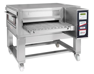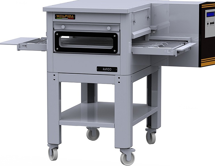 The design is equipped with stands on wheels, so it is convenient to move it if necessary. The patented hot air flow system ensures even heat distribution, which prevents excessive overdrying of products, which means that pizza is baked at lower temperatures than conventional ovens, thereby saving energy consumption.