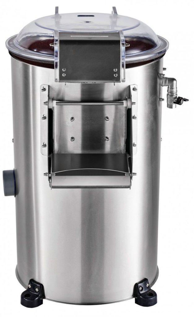 Another notable feature of the device is the automatic unloading system for peeled vegetables. All main elements of the vegetable peeler are made of stainless steel, as they are constantly in contact with water. The manufacturer allows washing removable parts in the dishwasher. Cleaning is carried out due to the mechanical friction of vegetables on the surface of the abrasive disc and the walls of the hopper. The wall coating is also abrasive and can be easily replaced from the outside by the operator.