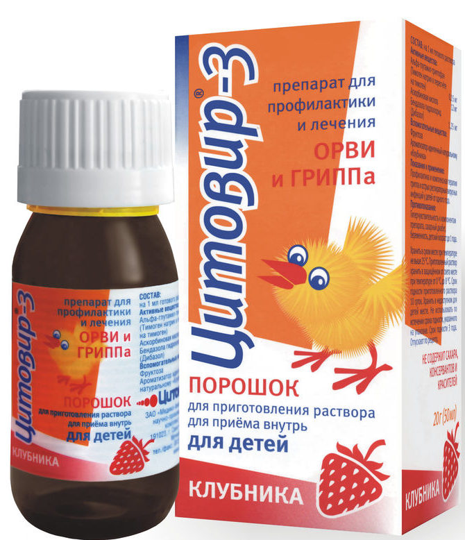 Immunostimulating agent, effective in the treatment of influenza and SARS. The taste of strawberries is very popular with children, so it is convenient to give medicine to the baby. The dosing device allows you to measure the required dose and prepare a suspension (solution). The drug is applicable for one year of age. Price: 436 rubles.