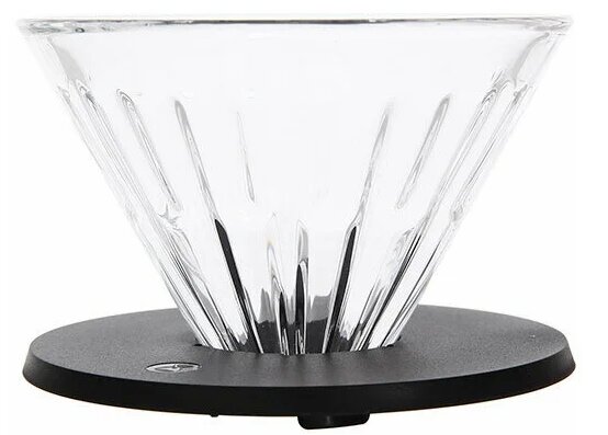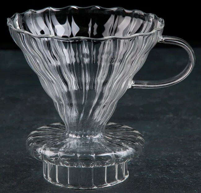 The glass pourover features a wavy top edge. The inner surface is covered with wavy transitions. The dimensions of the base are smaller than the diameter of the top, there is a high stand, a thin handle.