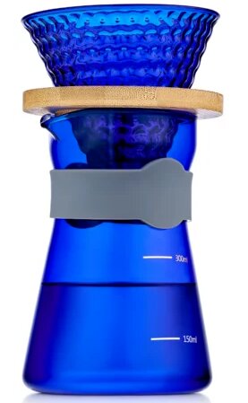 It consists of three parts: vessel, funnel, stand. The vessel has the shape of a laboratory flask with a small spout. The jug is made of heat-resistant translucent blue glass, without a pattern. On the front side there is a scale (ml): 150, 300. The upper part under the neck is closed with a wide gray silicone strip (replacement of the side bow).