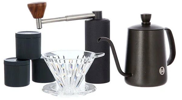 Consists of seven parts: Crystal Eye Drippe funnel, Fish Kettle, Tiememore Nano coffee grinder, three containers, paper filters (10 pieces). The whole set is packaged in a dark case that closes with a zipper.