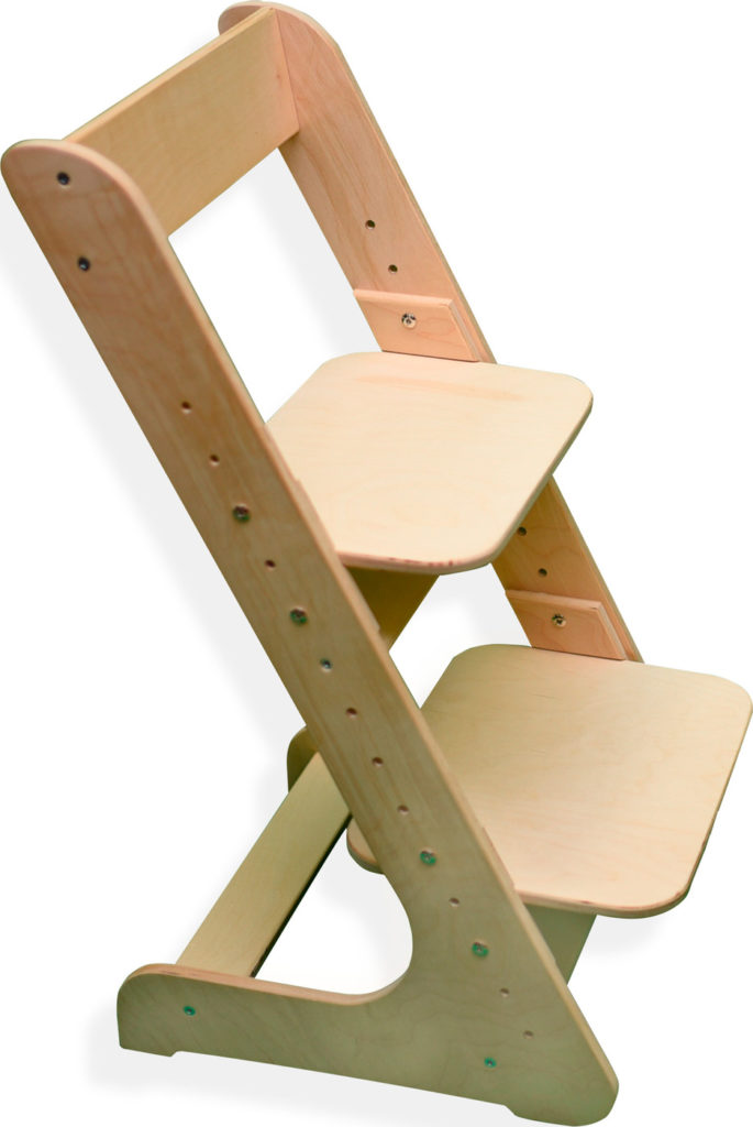 This model has a simple design. Outwardly, it looks like a regular chair, on which you can adjust the height of the seat. The model is made of wood, so it is absolutely safe for health.
