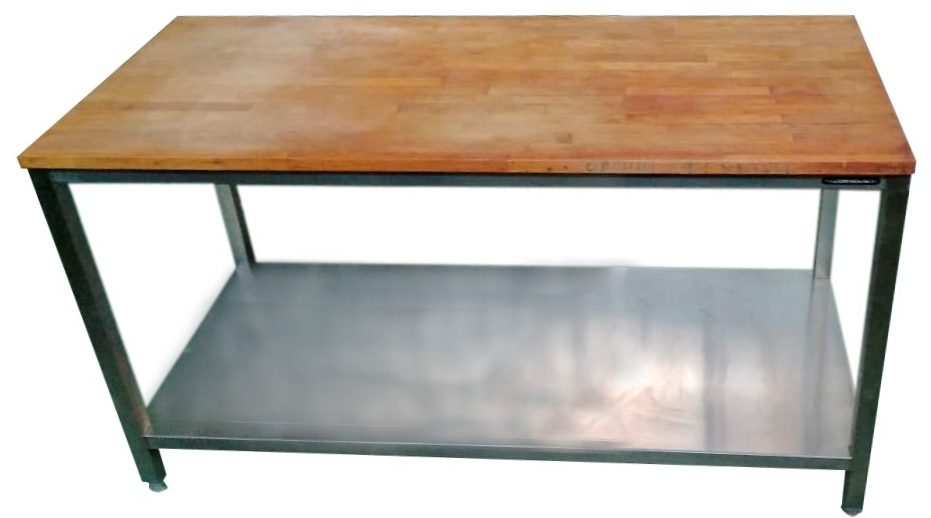 The production table can be used for cutting all kinds of products. Due to the stability of the legs, the product is often used to store kitchen appliances and utensils. The framework is made of stainless steel, a table-top wooden. In case of damage to the countertop, the material can be easily restored; the protective layer on the countertop prevents the wood from swelling and cracking. There is a removable side.