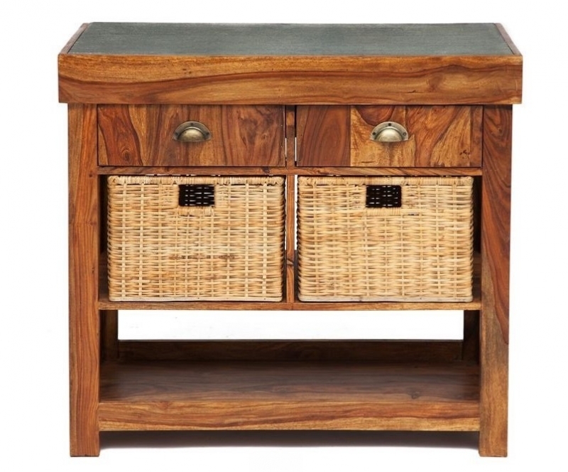 The furniture is made entirely of wood. It will decorate any kitchen. The tabletop is made of natural stone and will last a long time. The framework consists of two big wicker baskets for products. There are also two drawers for small kitchen and tools. The bottom shelf is often used to store dishes. Also a feature of the furniture is the presence of a special holder for towels. With the help of the device, the cooking process has become more comfortable and simple.