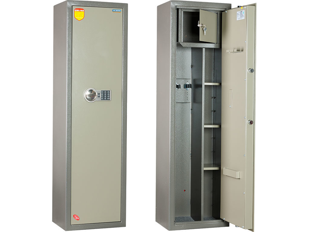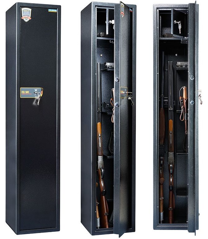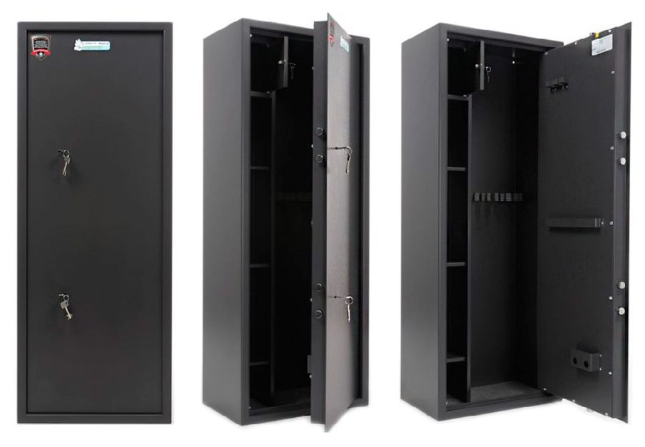Up to 5 guns will intervene in the device of the domestic manufacturer Best Safe. Its height reaches 155 cm, so it is an excellent option not only for rifled weapons, but also for long-barreled ones. The walls are made of steel, the thickness of which is 3 mm. It closes with an American electronic lock. Its main feature is the ability to work with two codes of different users.
