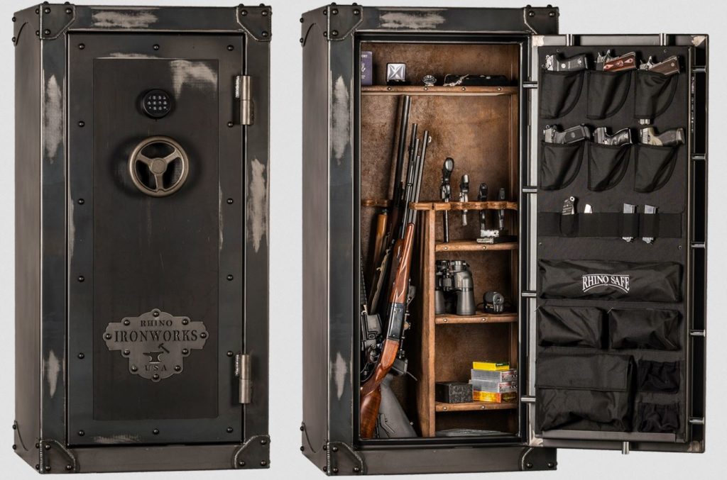 The storage from the American manufacturer Rhino Ironworks has an original antique design that allows it to fit into any interior of the room. The fire resistance and burglary resistance of the product is confirmed by American certificates of conformity. The locking device is equipped with electronics, the lock is closed with an armored plate made of tungsten carbide. If the lock is tampered with, it will automatically lock. The cabinet is designed to store 28 barrels of massive weapons. The body is reinforced on the outside with welded overlays, inside is trimmed with soft eco-suede, which looks like worn leather. When the fixture is opened, the LED light inside automatically turns on. Weight 441 kg.