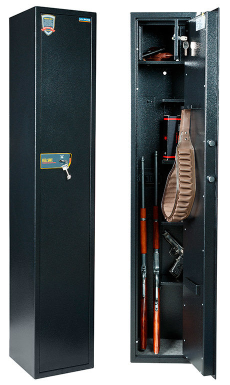 This, in the truest sense of the word, cabinet is 140 cm high and weighs 20 kg. The thickness of the metal is only 1 mm. Capacity is decent - fit up to 4 guns. The metal is coated on top with polymers that protect it from corrosion. Equipped with a pair of 3-bar locks. A feature that speaks in favor of this device is that there is a compartment for cartridges inside, which is also locked with a key.