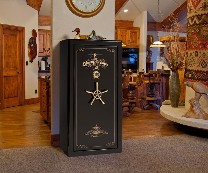 Another representative of the American company Liberty Safe, designed for 22 trunks, has a height of 1.54 m, is equipped with a reliable locking device from Sargent & Greenleaf. The lock itself has a protective plate made of hardened steel.