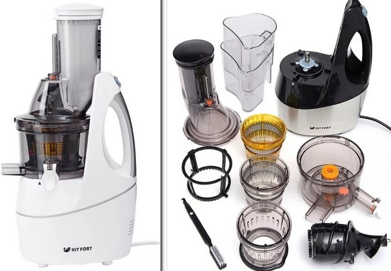 The principle of operation of the kitchen mechanism is as follows: fruits are placed in a container for loading, ground, and with the help of a shaft, they are squeezed through a sieve. Then comes the separation of juice and cake into different containers. The shape of the bowl and auger affects how fast the process of squeezing the drink will be.