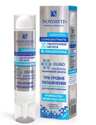 The transparent serum comes in the form of a gel. The volume of the bottle is 35 ml. The product deeply moisturizes the epidermis. Hyaluronic acid in the composition of the drug effectively helps to smooth wrinkles. Nicotinic acid amide is needed to repair the skin and protect cells from melanin accumulations. The result is getting rid of age spots.