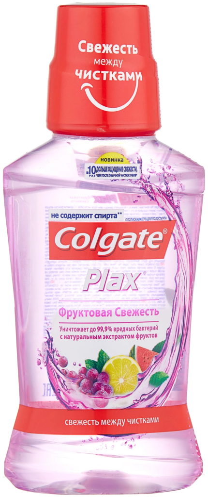 Colgate Plax Fruit Fresh with natural fruit extract fights harmful bacteria. The composition contains sodium fluoride, which protects against caries. The drug does not cause burning. The feeling of freshness lasts for a long time. The spray does not contain alcohol.