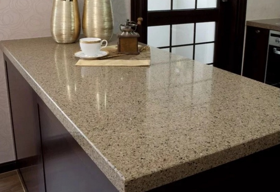 Such models of covering furniture modules consist of 93% natural quartz. However, the remaining 7% are coloring pigments, therefore, in the full sense of the word, such a stone cannot be called “natural”.These agglomerates are famous for being extremely resistant to interaction with various aggressive chemicals, so their surface is difficult to damage.