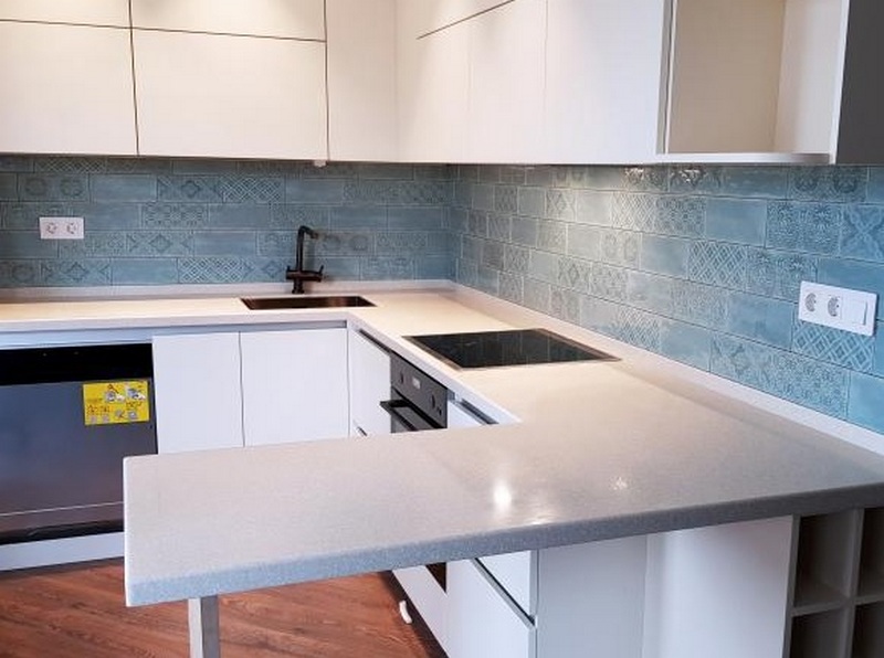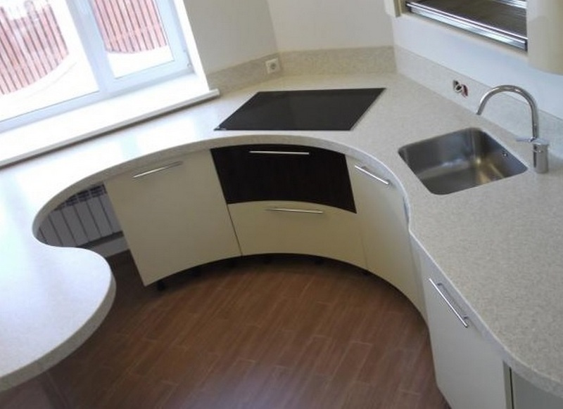 Another classic shape that can easily fit into the dimensions of any home kitchen. The length of such a module will not exceed three meters, while it will be made in the form of a monolithic canvas. If more elastic pure acrylic is used for production, then the module can have a longer length. If you use quartz vinyl, then the module can be made separate, and the individual parts can be fastened with adhesive. At the same time, with the proper level of grinding of the seam distances, they can easily be made almost invisible.