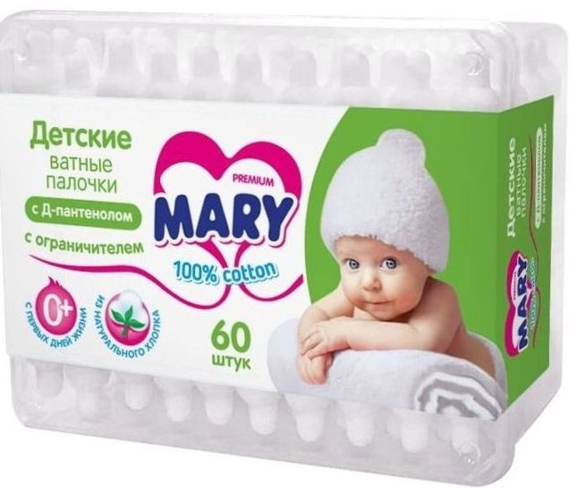 The Mary Premium brand belongs to the Russian company Torres LLC, this organization produces a whole series of products for children and mothers. Cotton buds are no exception, they are available both with and without a limiter, but the most popular among mothers are those that have a limiting bulge and are impregnated with D-panthenol.