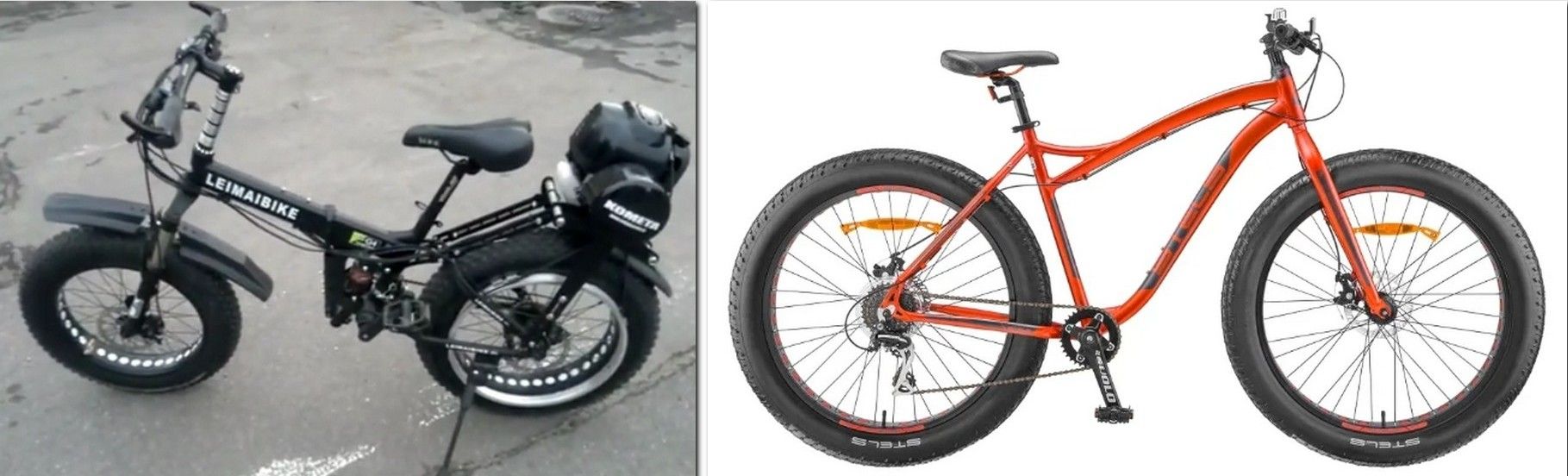 For comparison, a bicycle from the Chinese manufacturer "LEIMAIBIKE" is offered. It is more modernized: folding with a spring-elastomer fork and rear wheel drive. The design is equipped with a 4-stroke Honda-GX35 engine. It is quiet and economical: fuel consumption per 100 km is approximately 1.3 liters of petrol. All other main parameters are indicated in the table.