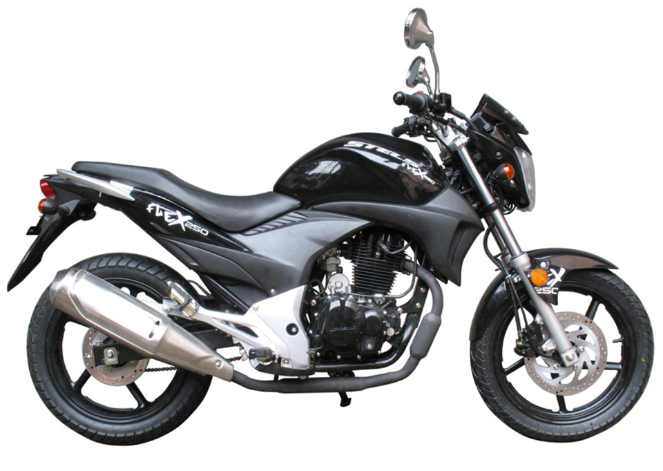 A stylish inexpensive model of a solid city bike with original front and rear optics, as well as a “space” plastic body kit that gives a little dynamism and aggression. Equipped with a single-cylinder four-stroke engine 225 cm3, interlocked with a five-speed transmission, powered by a carburetor, air cooling system. A modern electric starter with contactless ignition is electronically controlled, there is no kick starter.