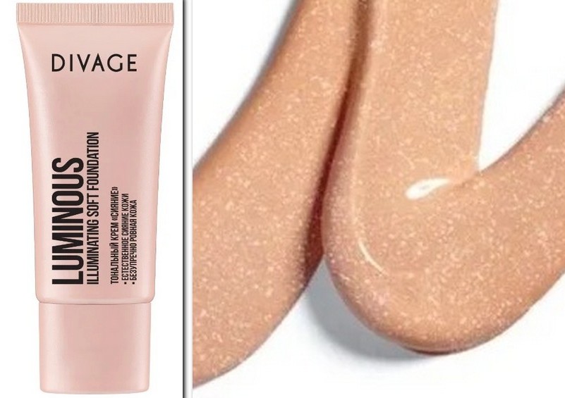 The foundation from the Russian brand "DIVAGE" is suitable for all skin types, has a leveling effect. The tube with the contents is small, only 25 ml. The active ingredient is panthenol.A distinctive feature of the base is the presence of sparkles in the composition of the cream.