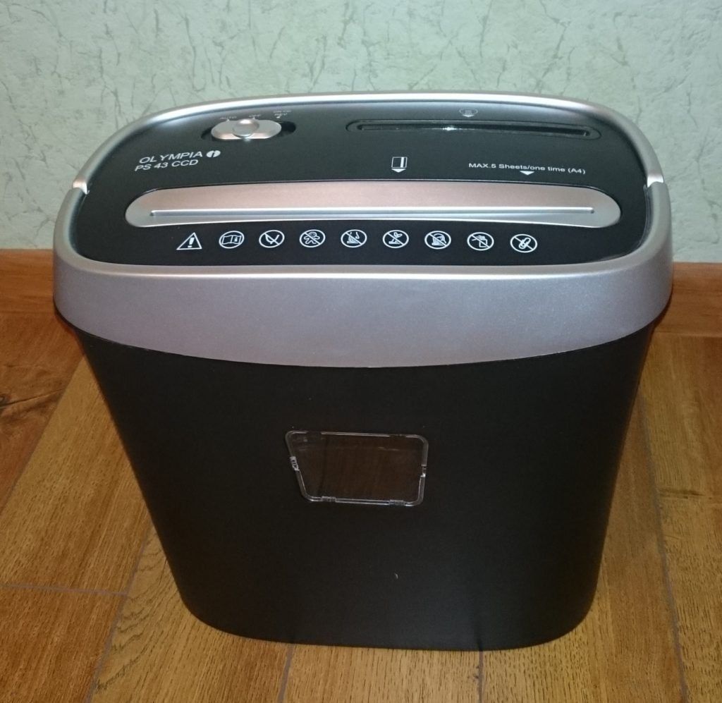 Olympia PS 43 CCD is on the verge between industrial and office shredders. It can be used even at home. Tries the appliance from the outlet. The handle for lifting the lid of the device helps to quickly free the unit from debris.The waste basket has a special viewing window to see how full the container is. The device is quite productive, therefore it makes a lot of noise.