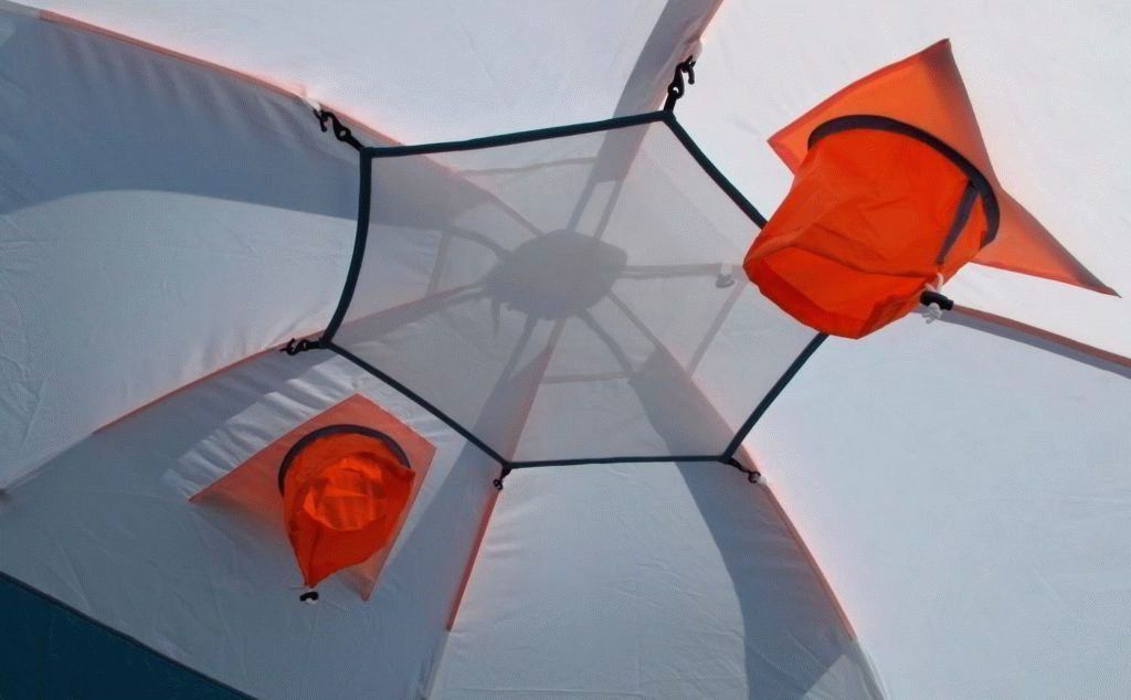 For ventilation, there are two special valves. The inner layer of the coating is made of fine mesh. This model can be used in travel and hikes of medium complexity. Two people can be inside.