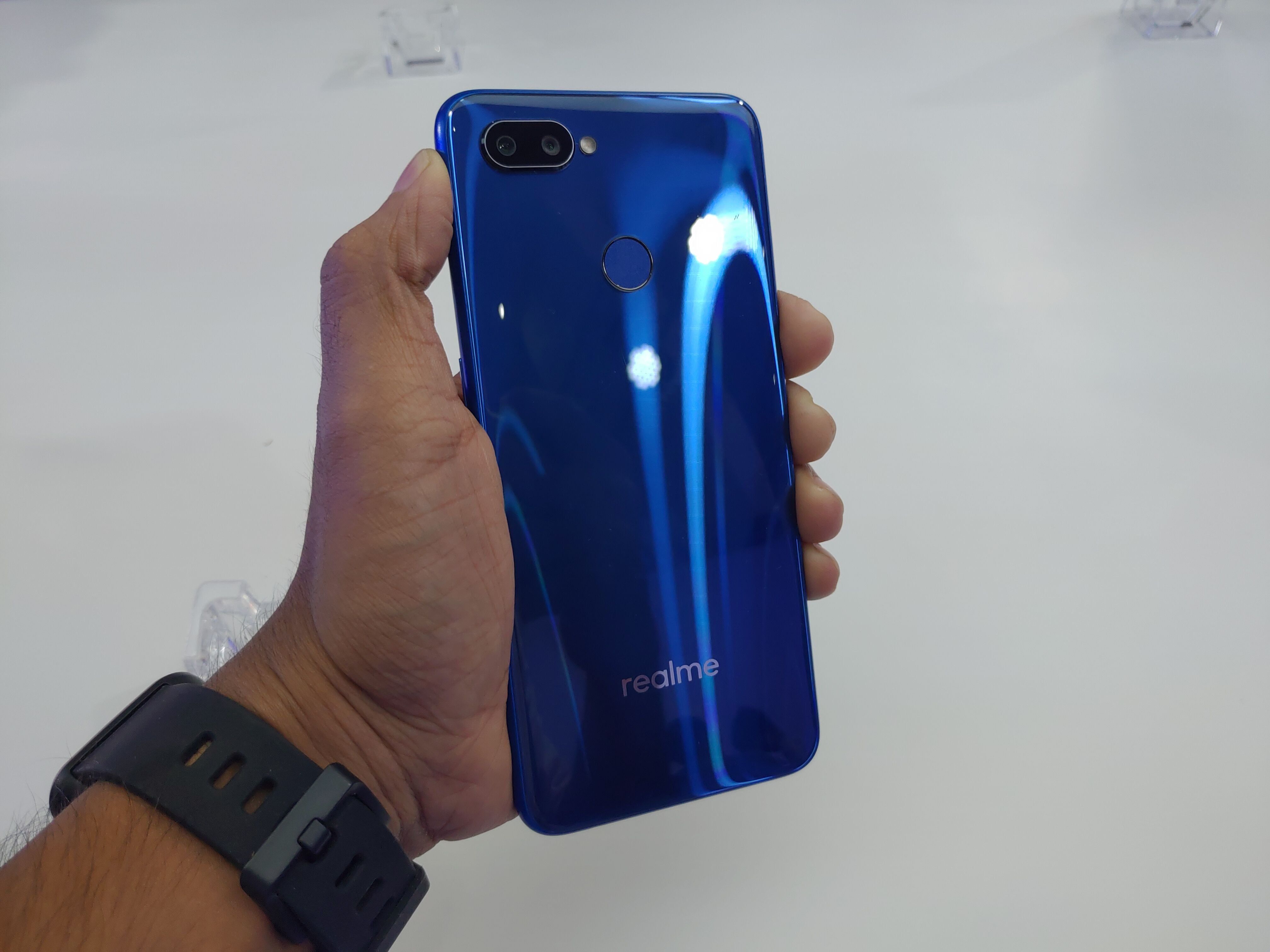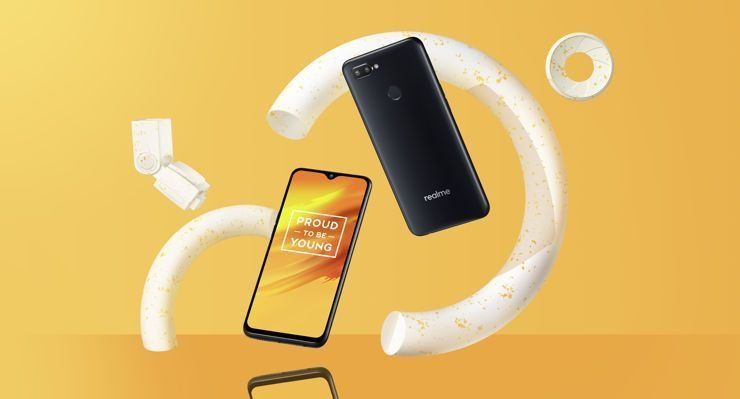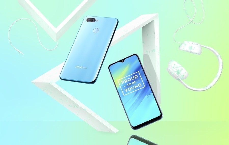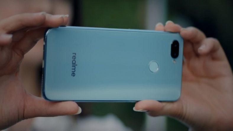 On the back panel, there is a rear camera on top, and a fingerprint scanner below. At the bottom is the Realme logo. At the bottom is a 3.5mm headphone jack, a micro USB port, and one speaker.