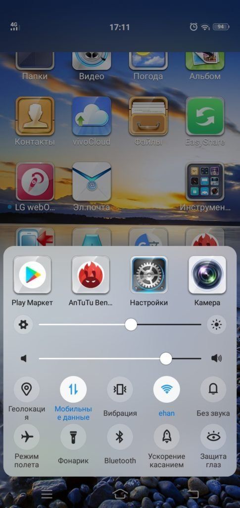 Funtouch OS 4.0 serves as the screen skin. This system is similar to the iPhone. All applications are sorted on the desktop because there is no corresponding menu. This shell is not very convenient and it is almost impossible to change it. Swipe down to pop up notifications. This is terribly inconvenient when you swipe along the bottom of the screen and accidentally click on it.