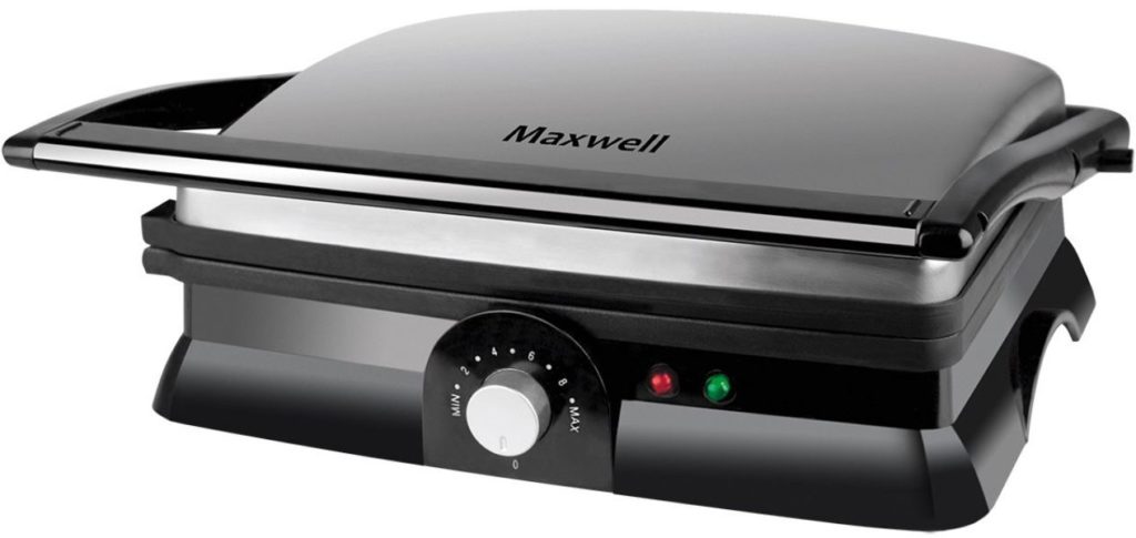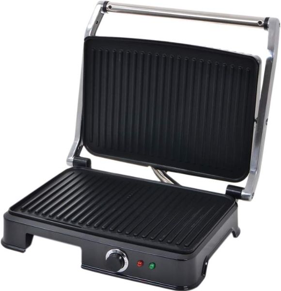 This electric grill has simple controls, it is equipped with a thermostat and a temperature indicator.The heating plates are made of aluminum with a non-stick coating, which allows you to cook without the use of oil. There is also a removable grease tray.