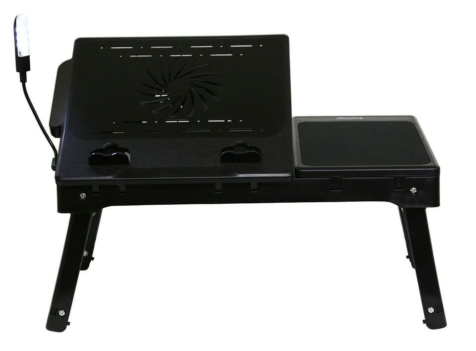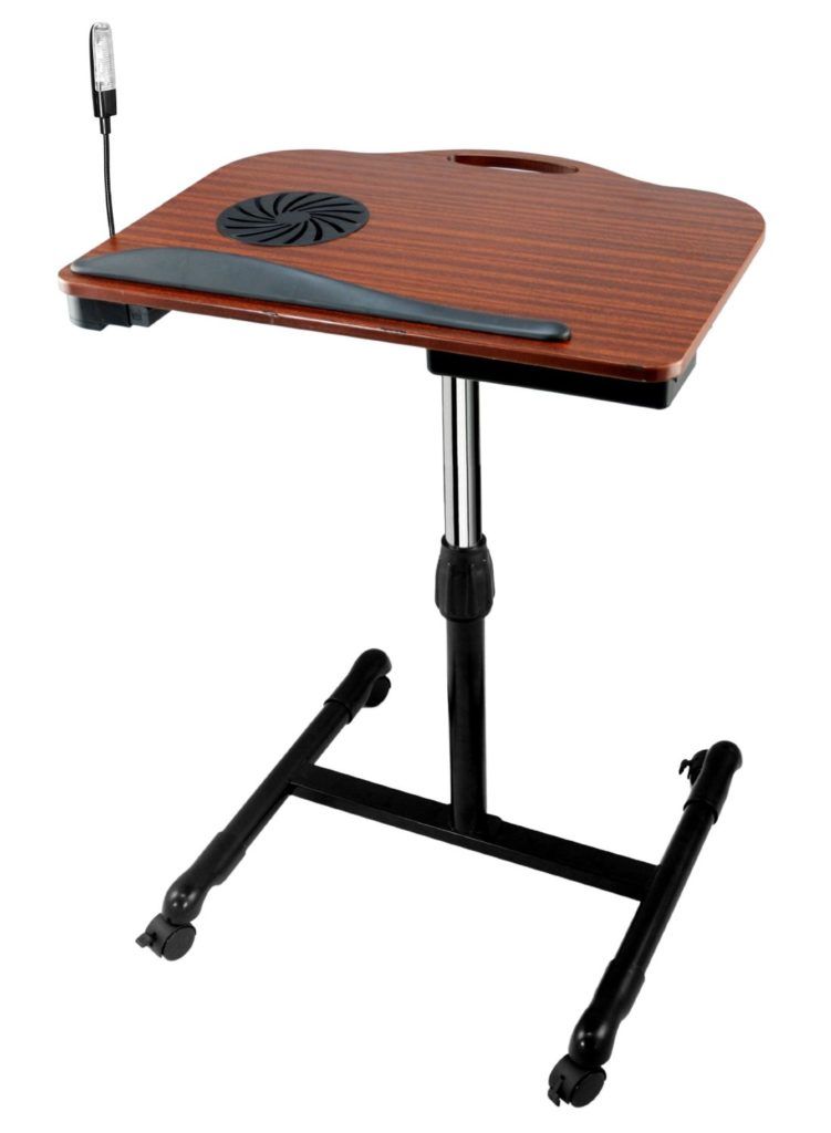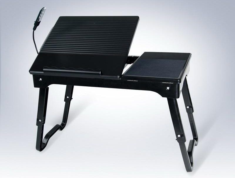 Here you can adjust the height for absolutely any person. The fan in the design is placed on the left side. This is done because most laptop models have a video card located in the same place. At night, the built-in lamp, which runs on batteries, will become an indispensable assistant. In addition, the accessory allows you to store various writing utensils, and can also be moved thanks to the built-in wheels. Its cost is 2400 rubles.