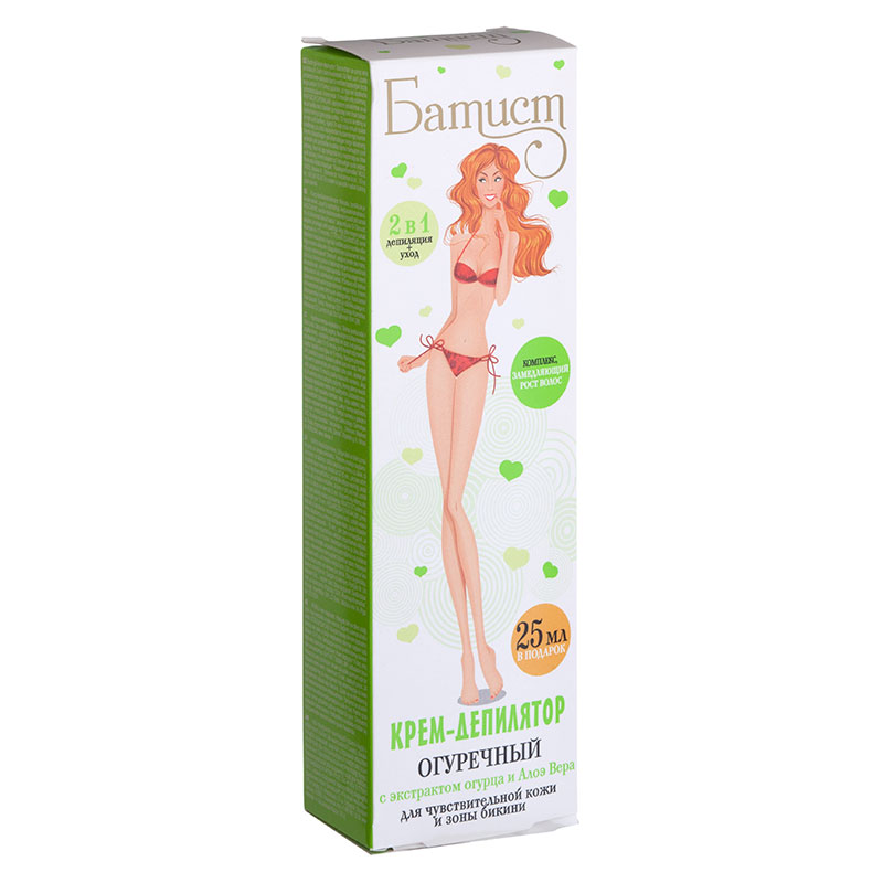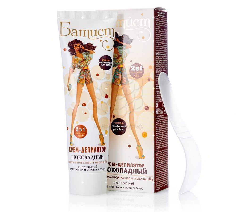- Batiste (fabricante - la empresa "cosméticos rusos"). Una serie de presupuesto popular, que incluye no solo cremas depilatorias, sino también lociones para aplicar en la piel después del procedimiento y productos que ralentizan el crecimiento del vello.