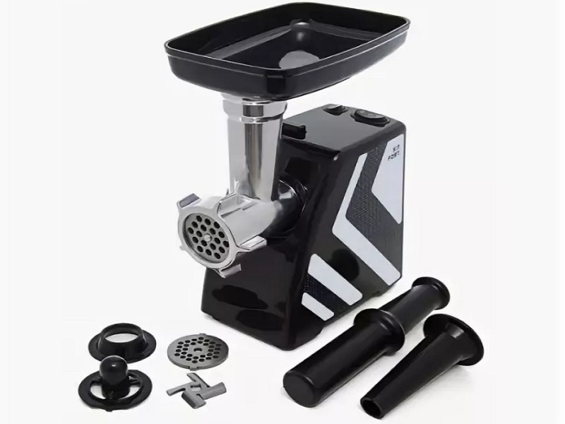 El conjunto incluye boquillas: 2 discos moldeadores, Ø 5 mm y Ø 7 mm; Accesorio para kebbe y accesorio para salchichas caseras. Como cuchillos, se utilizan 4 cortadores, que están hechos de acero inoxidable. La picadora de carne eléctrica tiene una potencia nominal de 300 W, con cargas a corto plazo de hasta 1,5 kW.