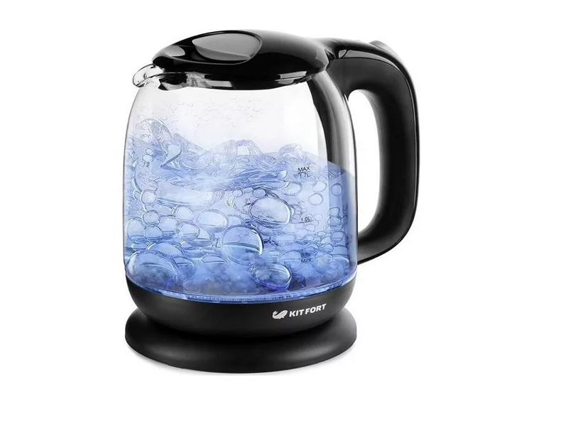 Cómo funciona: El matraz de la tetera se llena con agua no más que la marca "max" y no menos que la marca "min". Lo ponen en una plataforma que está conectada por un cable eléctrico a la red. Encienda el hervidor con el botón, la retroiluminación LED se enciende, el agua se calienta. Al hervir, el botón se apaga automáticamente.