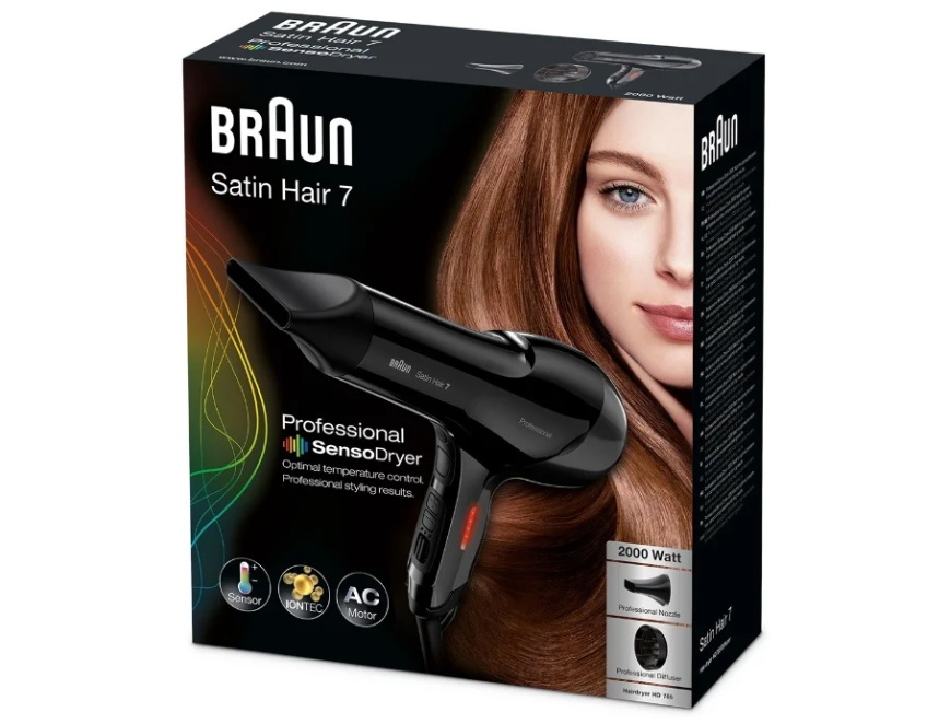 La Braun HD 730 Satin Hair 7 tiene una función de ionización y suministro de aire frío, una potencia de 2200 vatios, un total de seis modos de funcionamiento, incluidos tres modos de calentamiento, dos velocidades del grado de soplado. A diferencia de otros modelos, este secador de pelo está equipado con un cable de 200 cm. Un lazo para colgar también es parte del diseño.