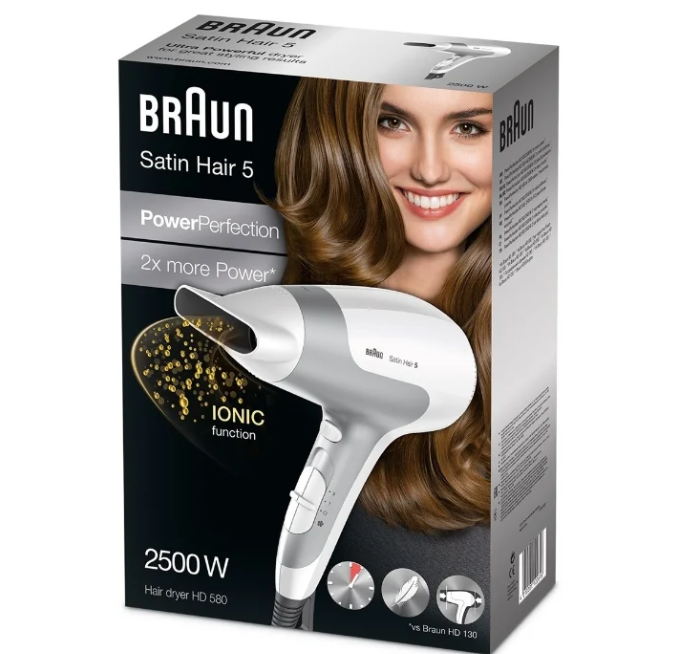 - Este es un buen electrodoméstico para uso individual. Con una potencia máxima de 2500 watts, cuenta con una opción de ionización automática del aire que dielectriciza el cabello y le da un brillo saludable.Además, la Braun HD 585 tiene un botón separado para encender el suministro de aire frío y el revestimiento cerámico del elemento calefactor evita que el cabello se sobrecaliente. Tres modos de calentamiento y dos velocidades de intensidad de flujo de aire.