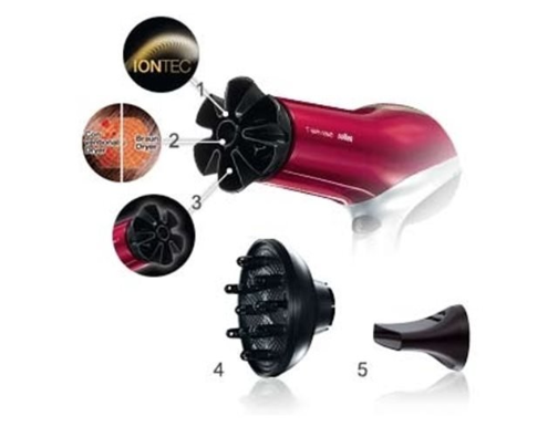 - Este es uno de los secadores de pelo más potentes de la gama. Con una potencia de 2500 vatios, este secador de pelo está diseñado con un bajo nivel de ruido. Se garantiza un peinado más rápido y profesional gracias al suministro mejorado de aire frío. La ionización automática le da al cabello suavidad y un brillo saludable.