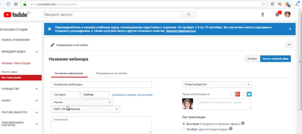 Durante el seminario web, puede desactivar el chat, incrustar el video en el sitio, grabar a través de un enlace o abrir el acceso, deshabilitar los comentarios, preajustar el retraso de la transmisión.