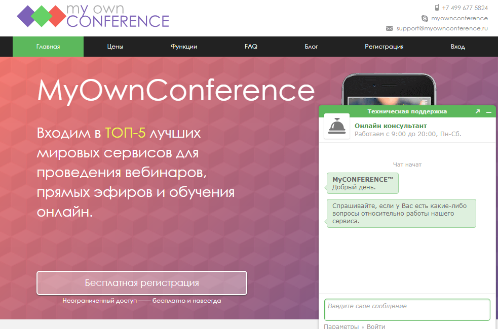 Interfaz intuitiva, pensada hasta el más mínimo detalle. El sitio rusificado facilita el trabajo del usuario. Puede aprender de forma remota cómo crear su propio seminario web. Para ello, existen libros electrónicos y diversos recursos, así como una videoguía.